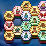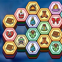 Een knusse winterpuzzel: maak het bord leeg door drie dezelfde hextegels op elkaar te stapelen